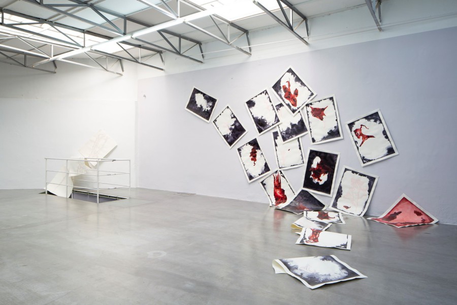 Fucus Vesiculosus in absentia. shellacink and watercolor on paper, each 85 x 106 cm. installation view at Lothringer 13 Halle, Munich. 2021